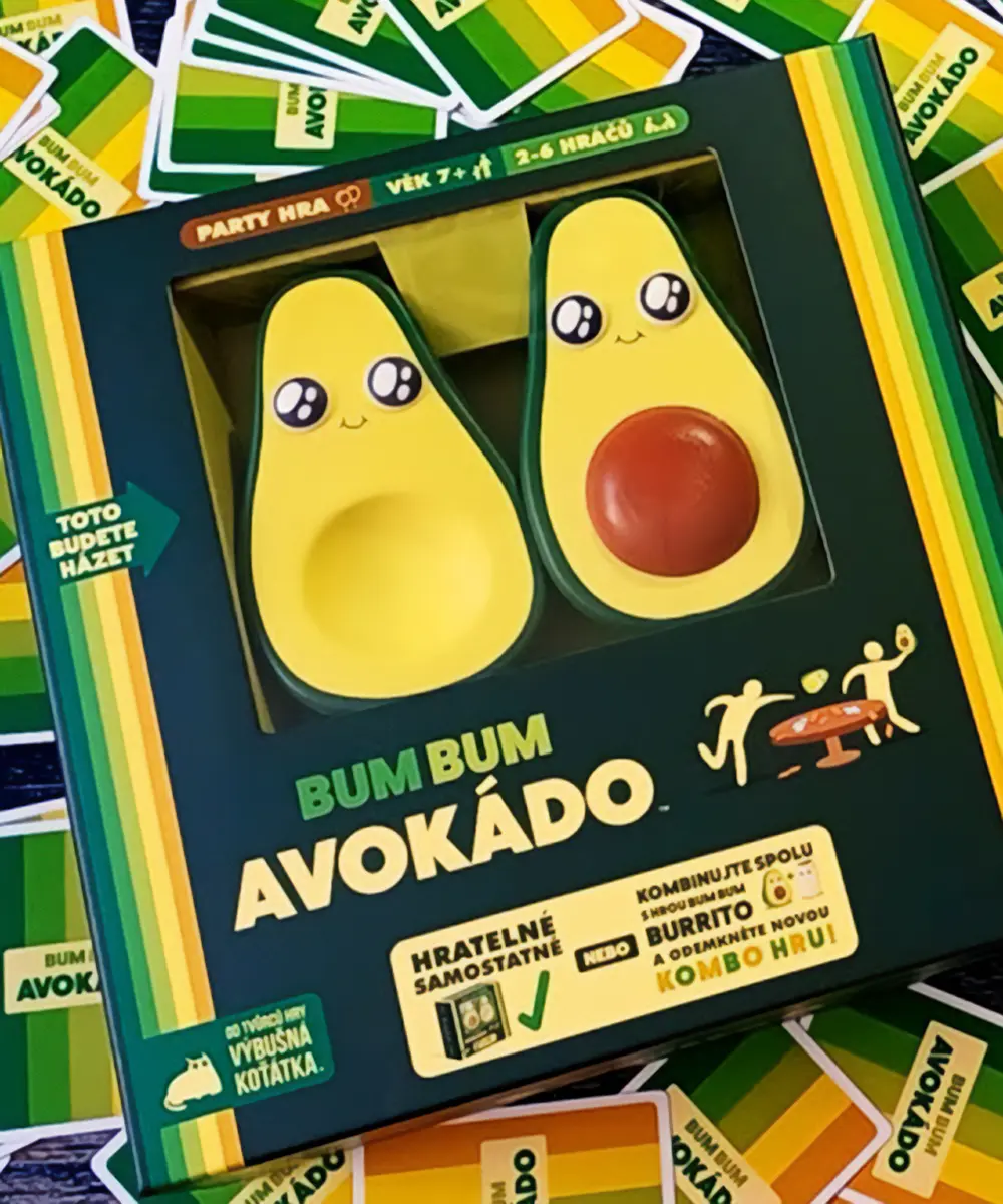 V Bum Bum Avokádu se snažíte nashromáždit co nejvíce bodů. Toho dosáhnete sbíráním trojic stejných karet, za které získáváte body. Ale pozor! Jakmile někdo vyloží trojici bitevních karet, rozpoutá se avokádová bitva. V tu chvíli se hra mění v divokou přestřelku, kde po sobě házíte měkká avokáda. Pokud jste zasaženi, ztrácíte body. Hra kombinuje rychlost karetní hry s fyzickou aktivitou a vytváří tak naprosto jedinečný herní zážitek plný smíchu a nečekaných zvratů.