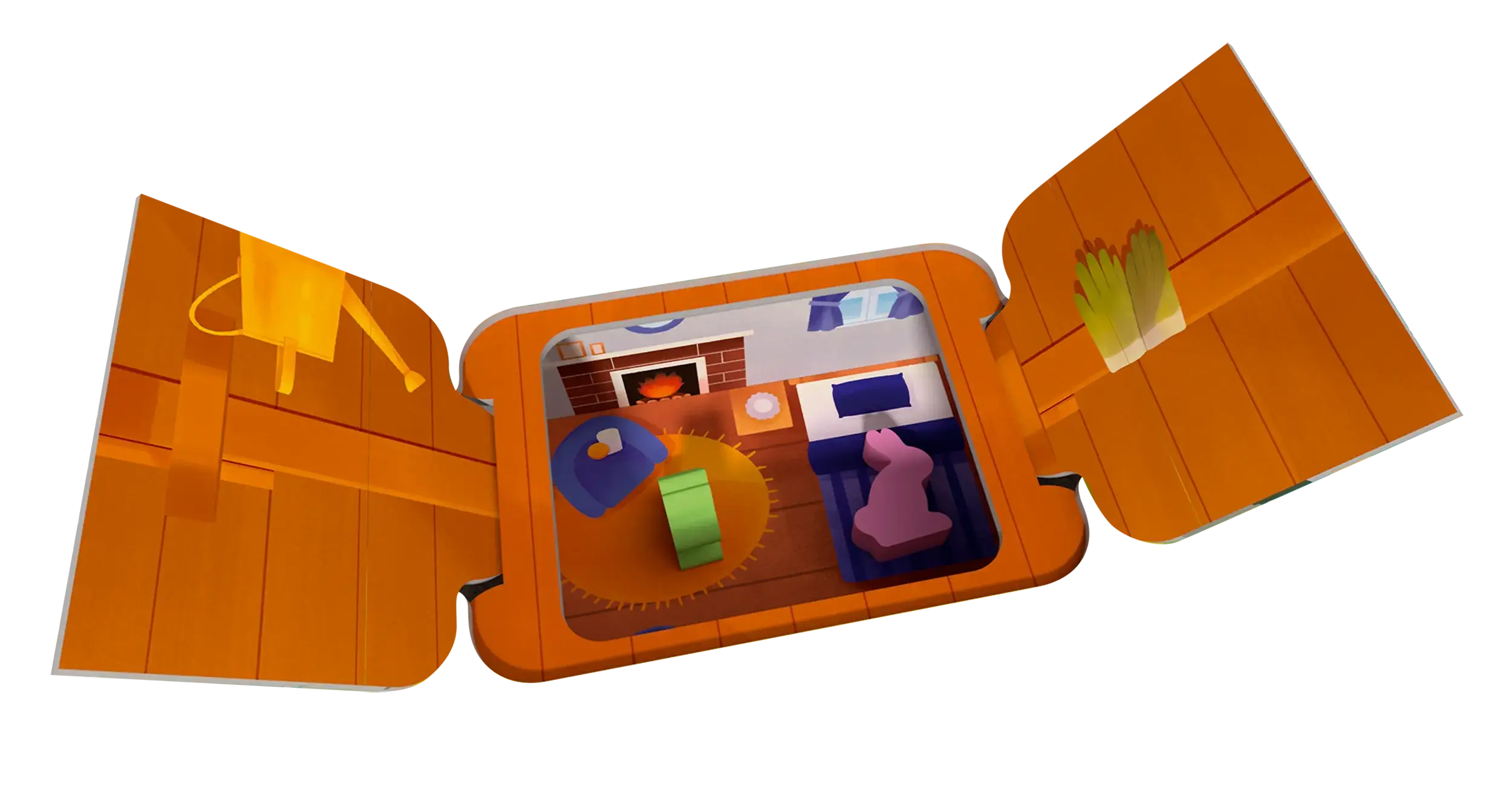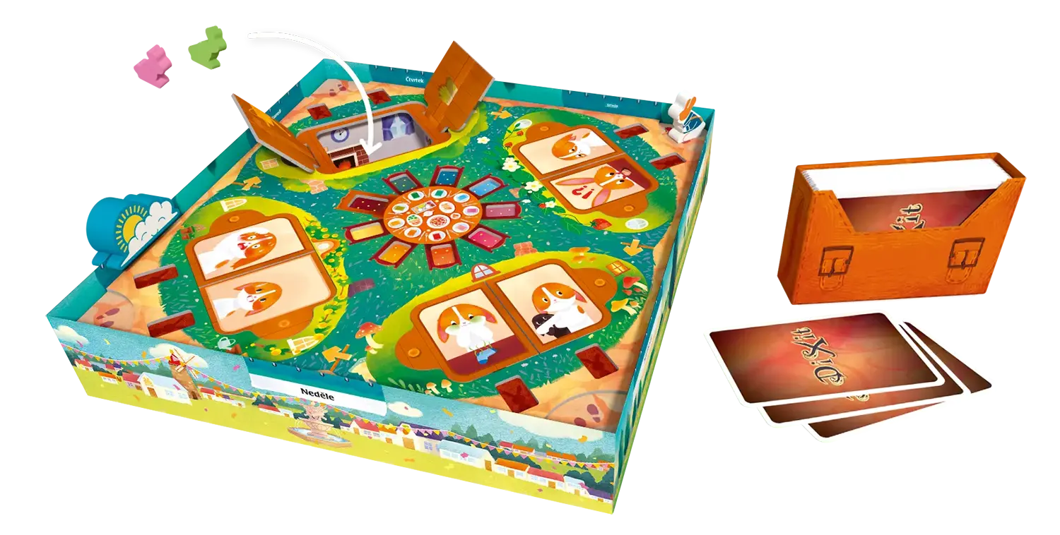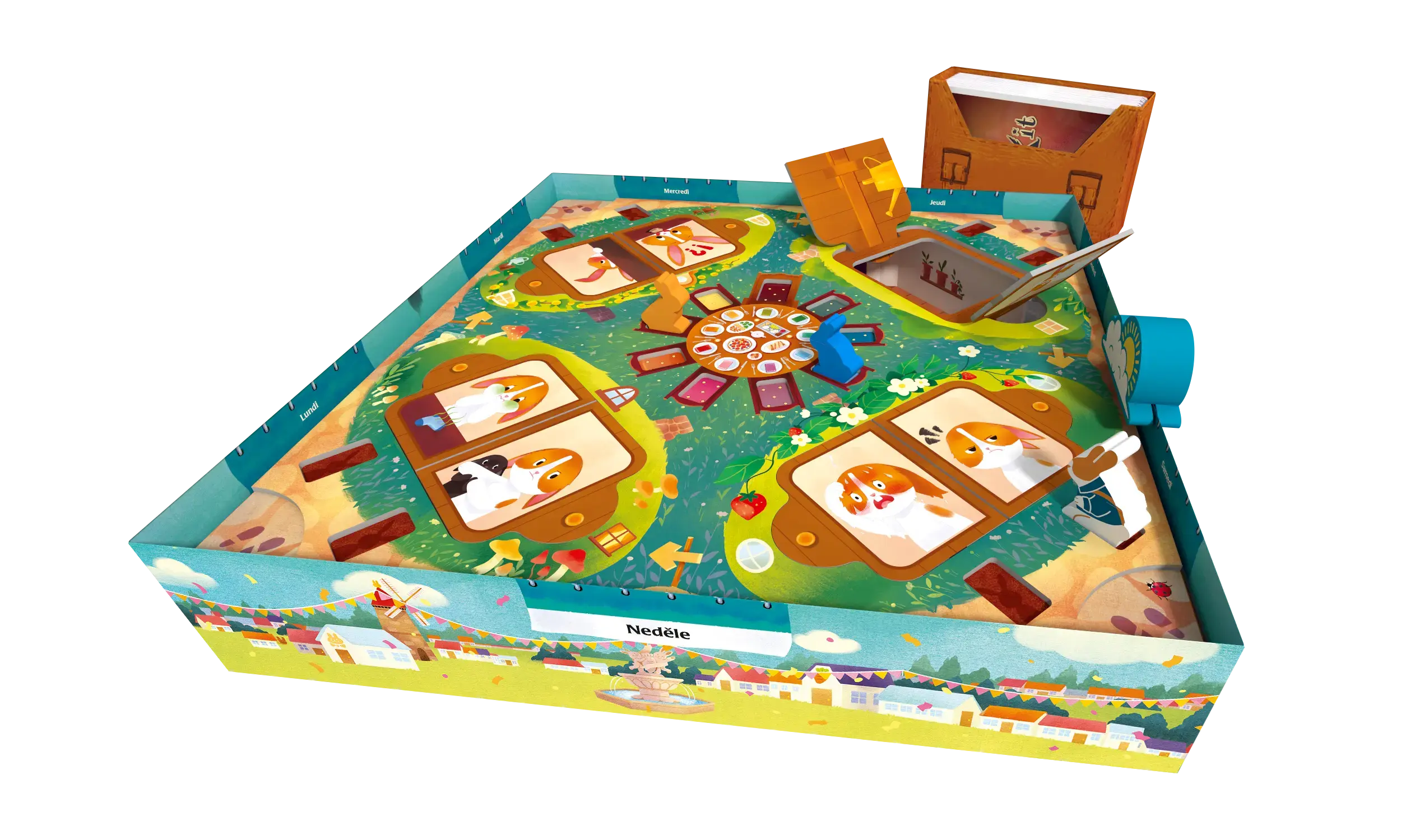 - Herní plán zabudovaný do krabice zapojí děti už při přípravě hry a otevírací dvířka nor přinášejí hmatatelný prvek, který dává každému kolu příjemný pocit očekávání.