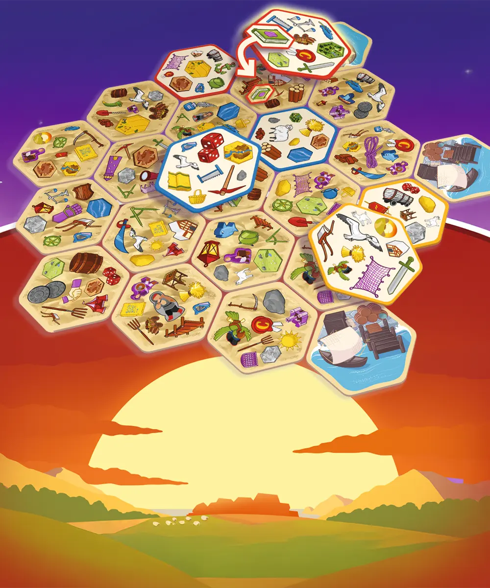Dobble Catan propojuje postřehový princip Dobble se světem Catanu. Týmová hra plná symbolů, miniher a svižných soubojů o body.