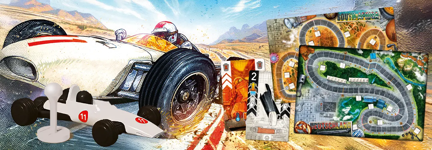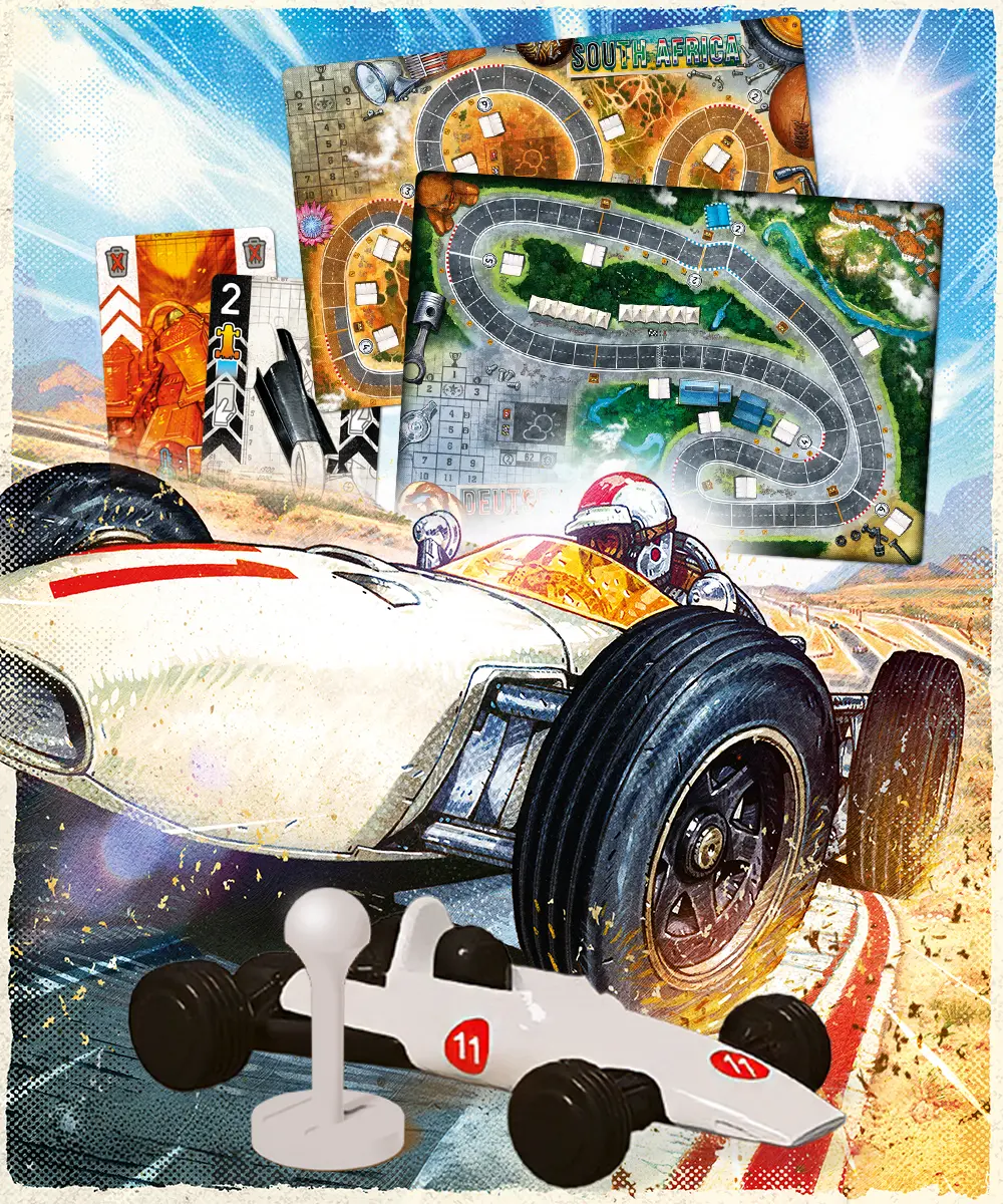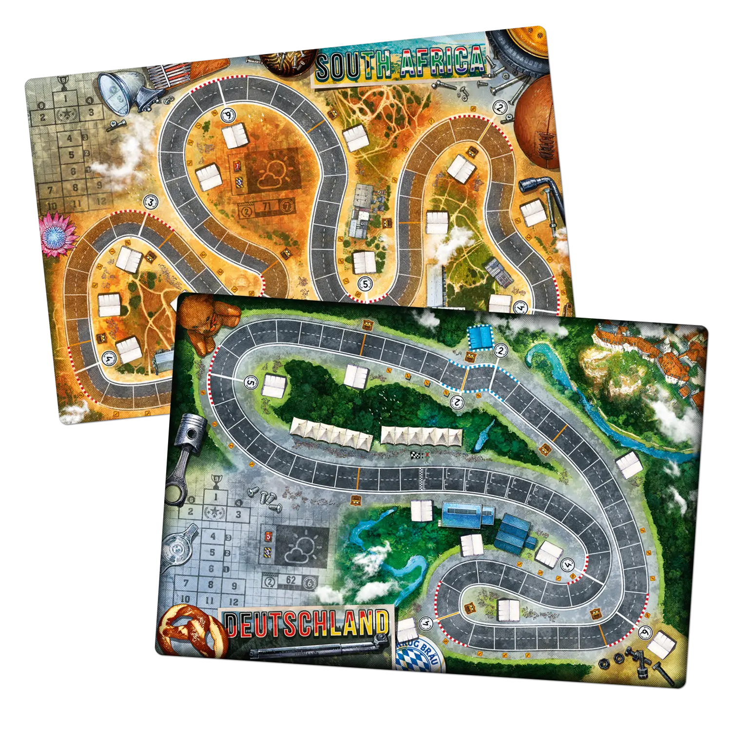 - 1 oboustranný herní plán se dvěma závodními okruhy (Jihoafrická republika a Německo)