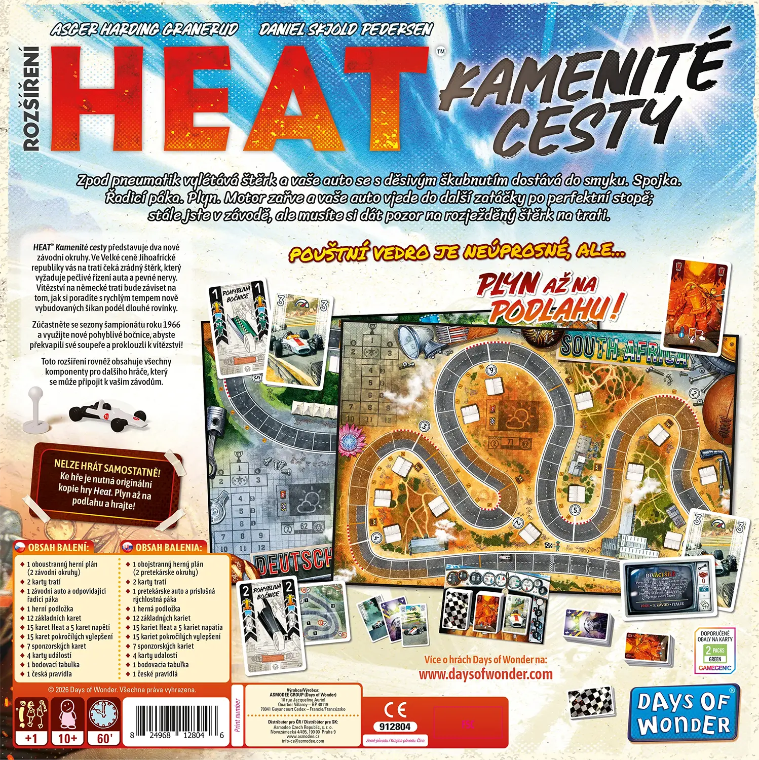 HEAT: Kamenité cesty je rozšíření určené pro všechny, kdo si chtějí závodění v HEATu užít ve větší variabilitě a s vyšší mírou napětí. Závodů se mohou zúčastnit 1–7 hráčů, doporučený věk je od 10 let a na jednu partii byste si měli vyhradit zhruba 60 minut. Rozšíření ocení především hráči, kteří mají základní hru dobře osahanou a hledají nové herní situace, odlišné tempo závodů a větší důraz na plánování. Díky přidaným mechanikám se budete častěji rozhodovat mezi riskem a bezpečnou jízdou. Zároveň se rozšiřují možnosti v režimu šampionátu i při hře s legendami. Přidaný obsah ale zůstává přehledný a snadno zapadne do stávajících pravidel.