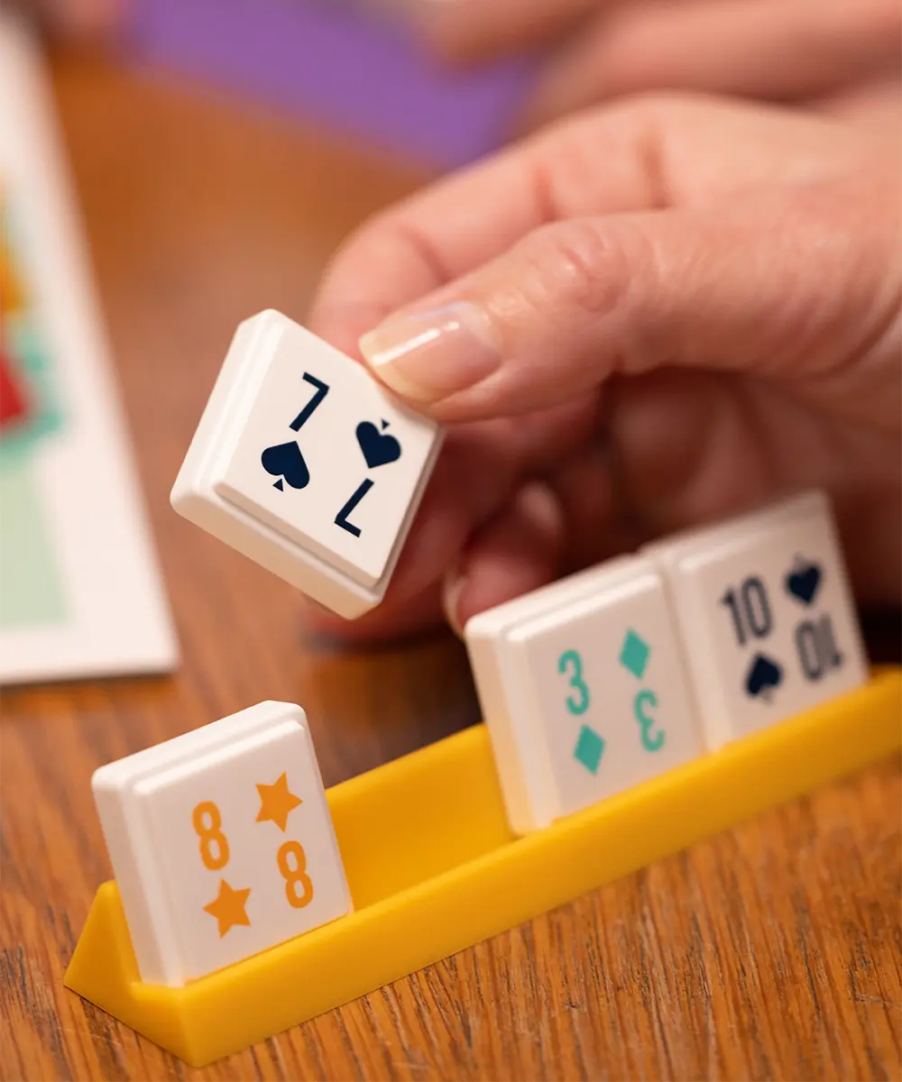 Taktické skládání čísel a barev v deskové hře KOMBI! Vytvářejte sady, plánujte tahy a porazte soupeře v této chytré rodinné hře.