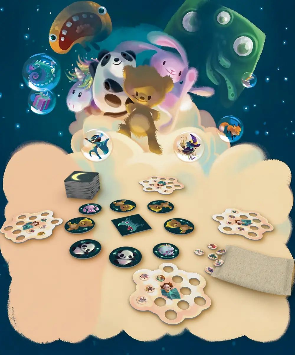 V Lapači snů se stanete ochránci sladkých snů. Vaším úkolem je vybrat správného plyšového kamaráda, který dokáže zcela překrýt kartu noční můry uprostřed hrací plochy. Čím menší plyšák, tím více snových žetonů získáte! Buďte však opatrní – pokud plyšák nezakryje celou noční můru, nezískáte nic. Hra kombinuje rychlost, pozorovací schopnosti a strategické myšlení, což z ní dělá zábavnou výzvu pro celou rodinu. Vítězem se stává hráč, který jako první zaplní svou desku 12 snovými žetony.