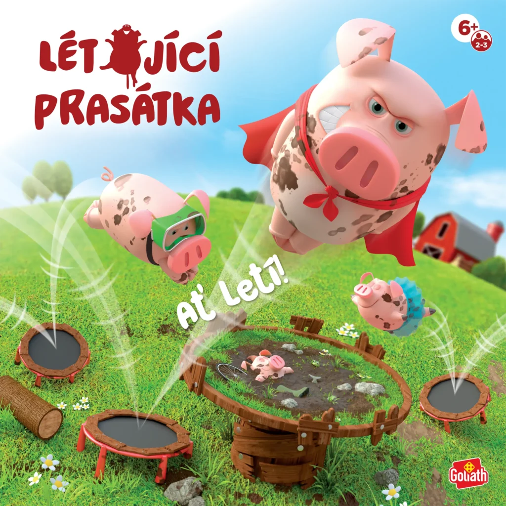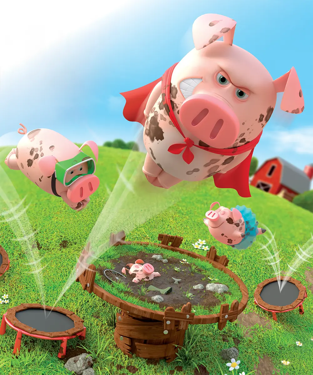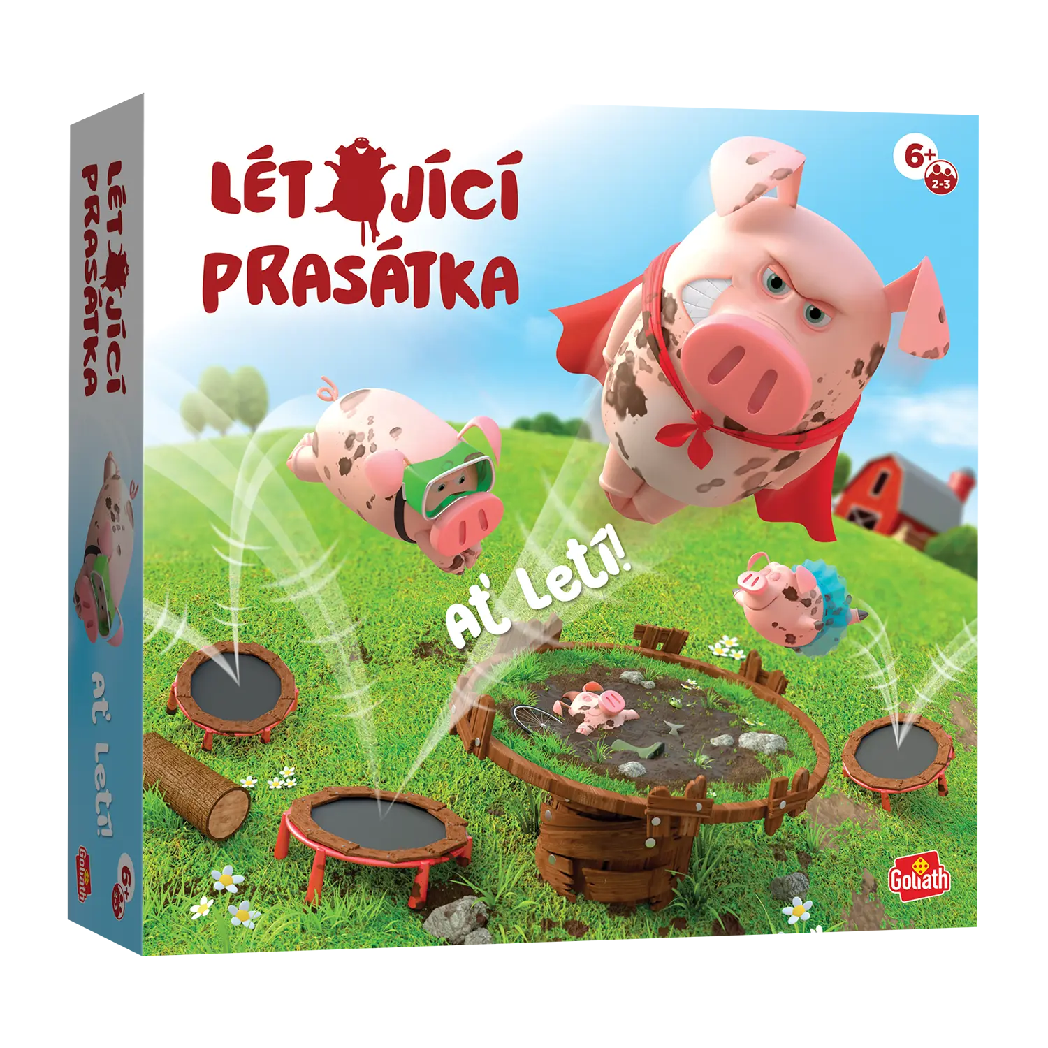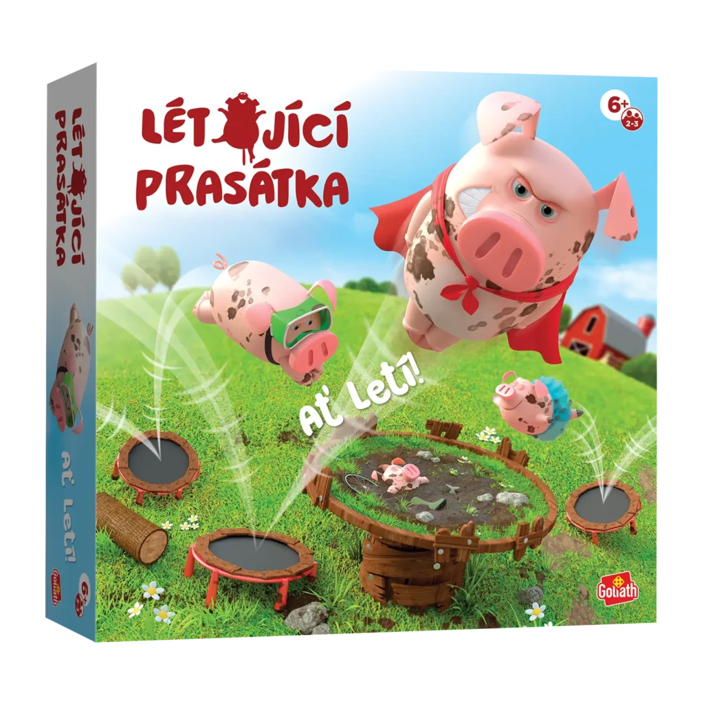 Ve hře Létající prasátka je vaším úkolem rozpohybovat trampolíny a vyslat gumová prasátka do vzduchu tak, aby přistála přímo v blátivé louži uprostřed prasečího chlívku. Každé úspěšné přistání znamená získání cákance bláta, který představuje vítězné body. Hra probíhá svižně a bez čekání – všichni hráči skáčou současně, takže o napětí i smích není nouze.