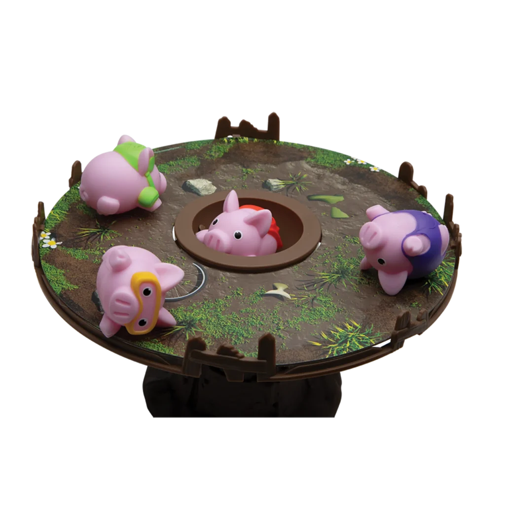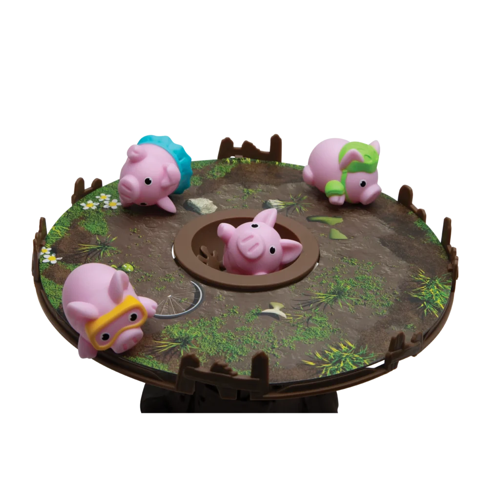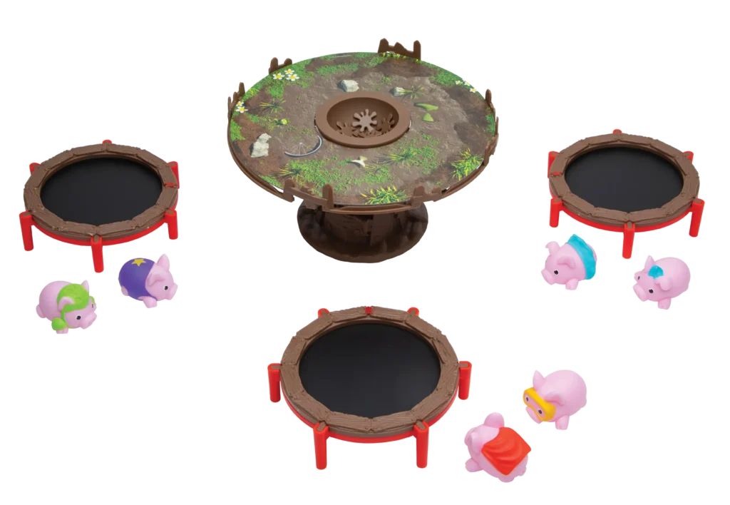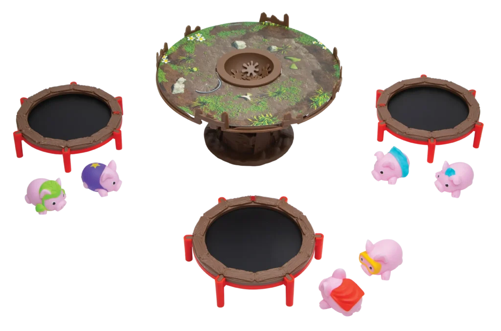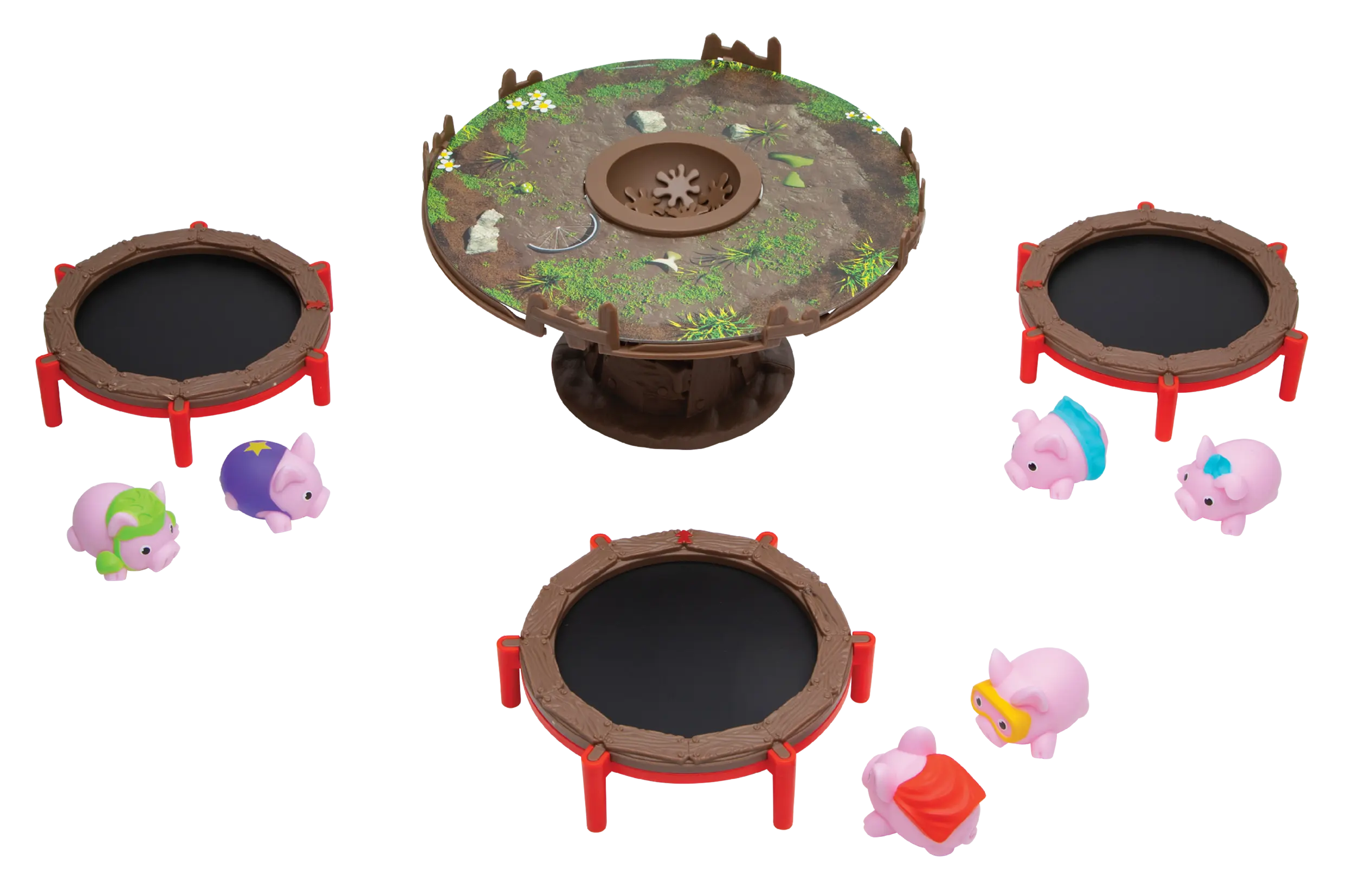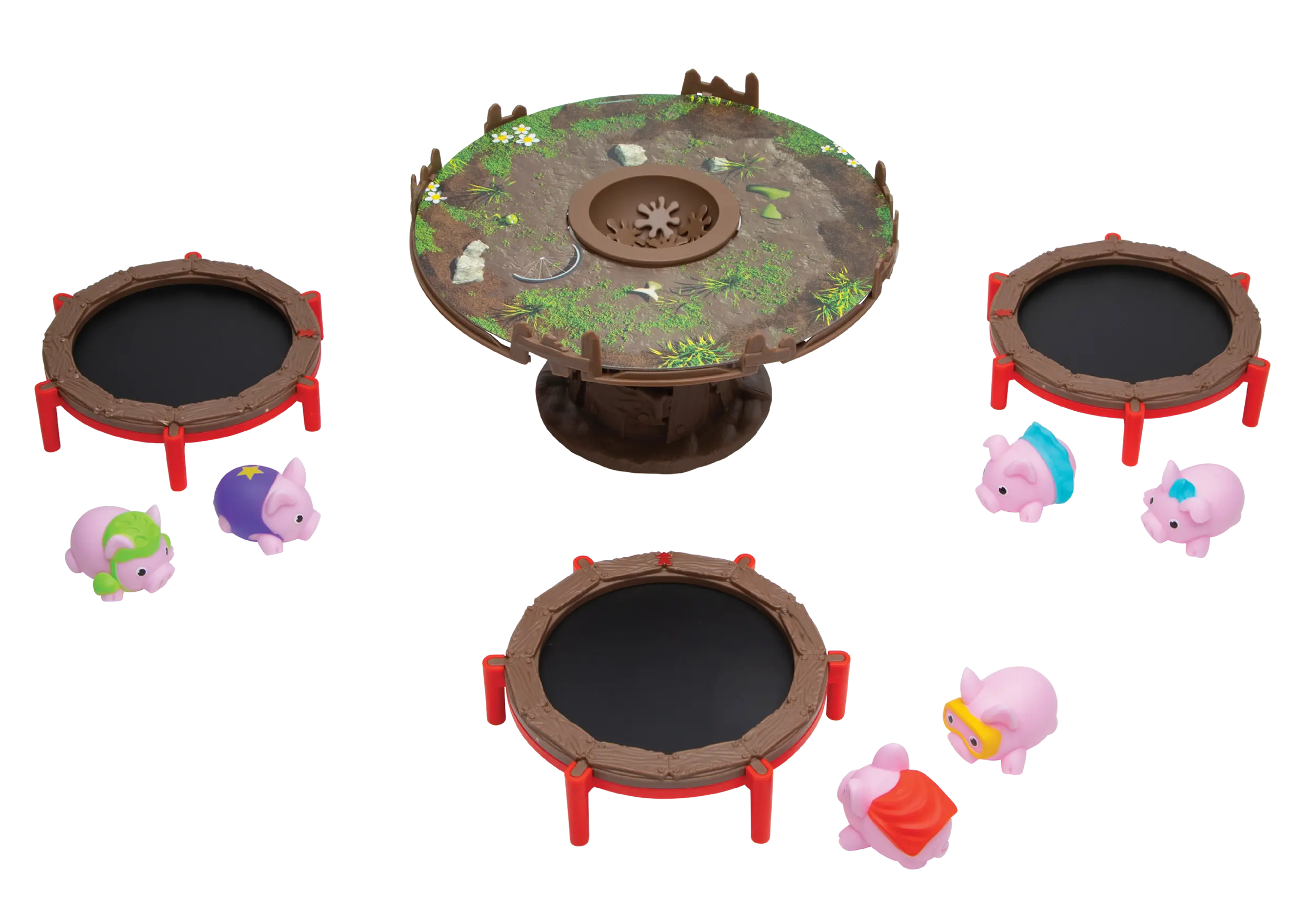Ve hře Létající prasátka je vaším úkolem rozpohybovat trampolíny a vyslat gumová prasátka do vzduchu tak, aby přistála přímo v blátivé louži uprostřed prasečího chlívku. Každé úspěšné přistání znamená získání cákance bláta, který představuje vítězné body. Hra probíhá svižně a bez čekání – všichni hráči skáčou současně, takže o napětí i smích není nouze.