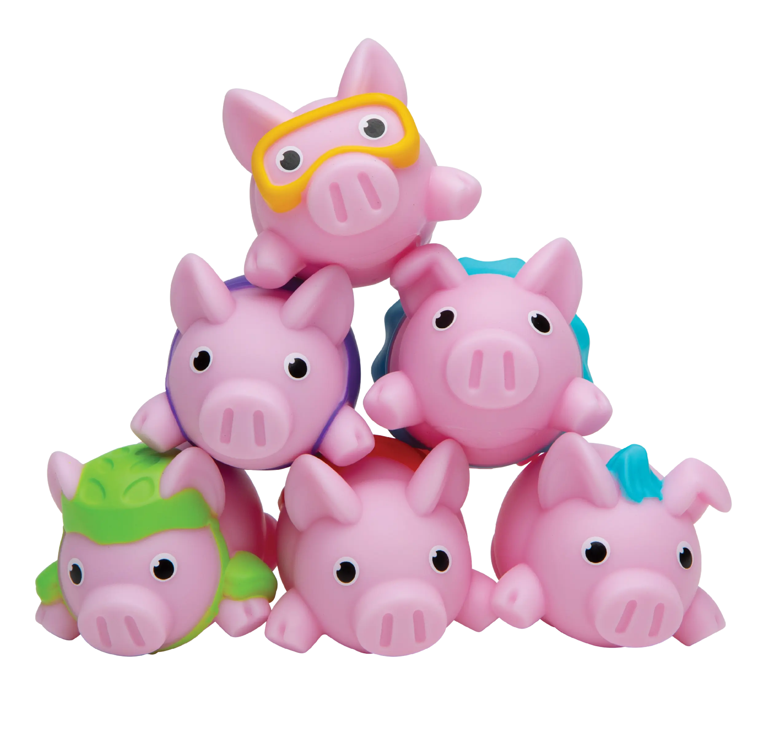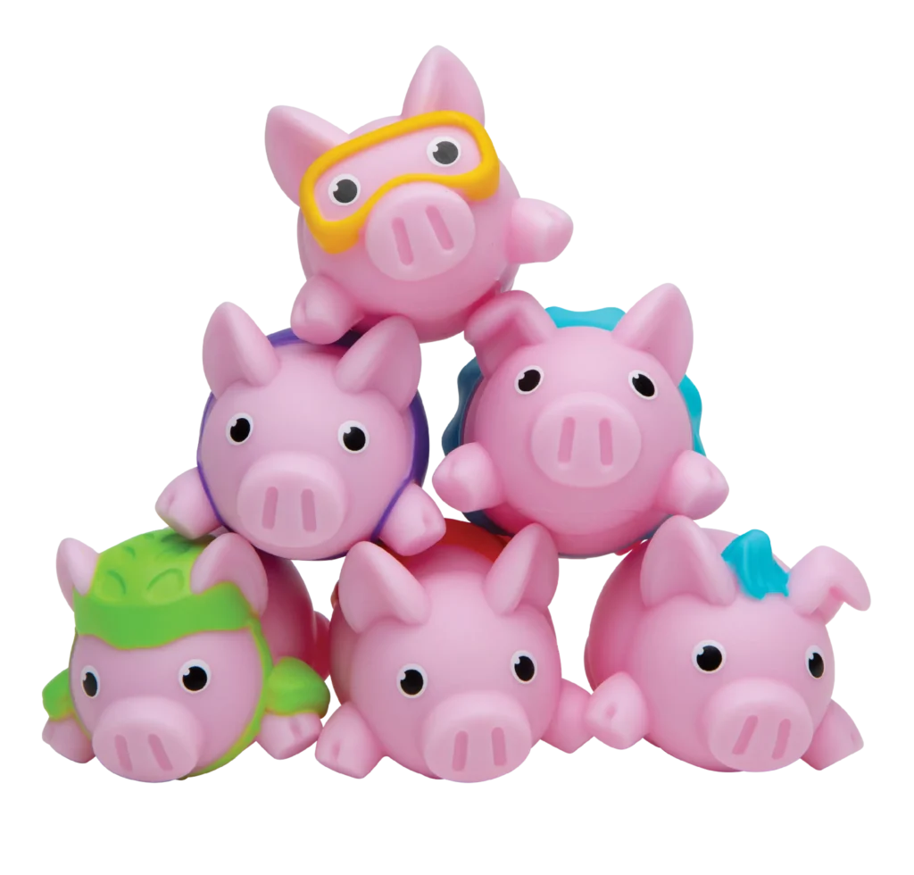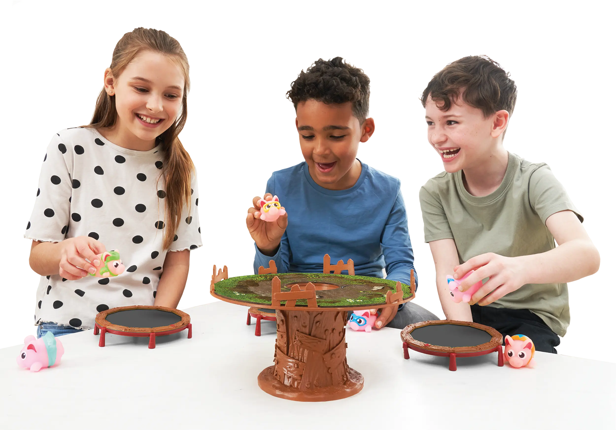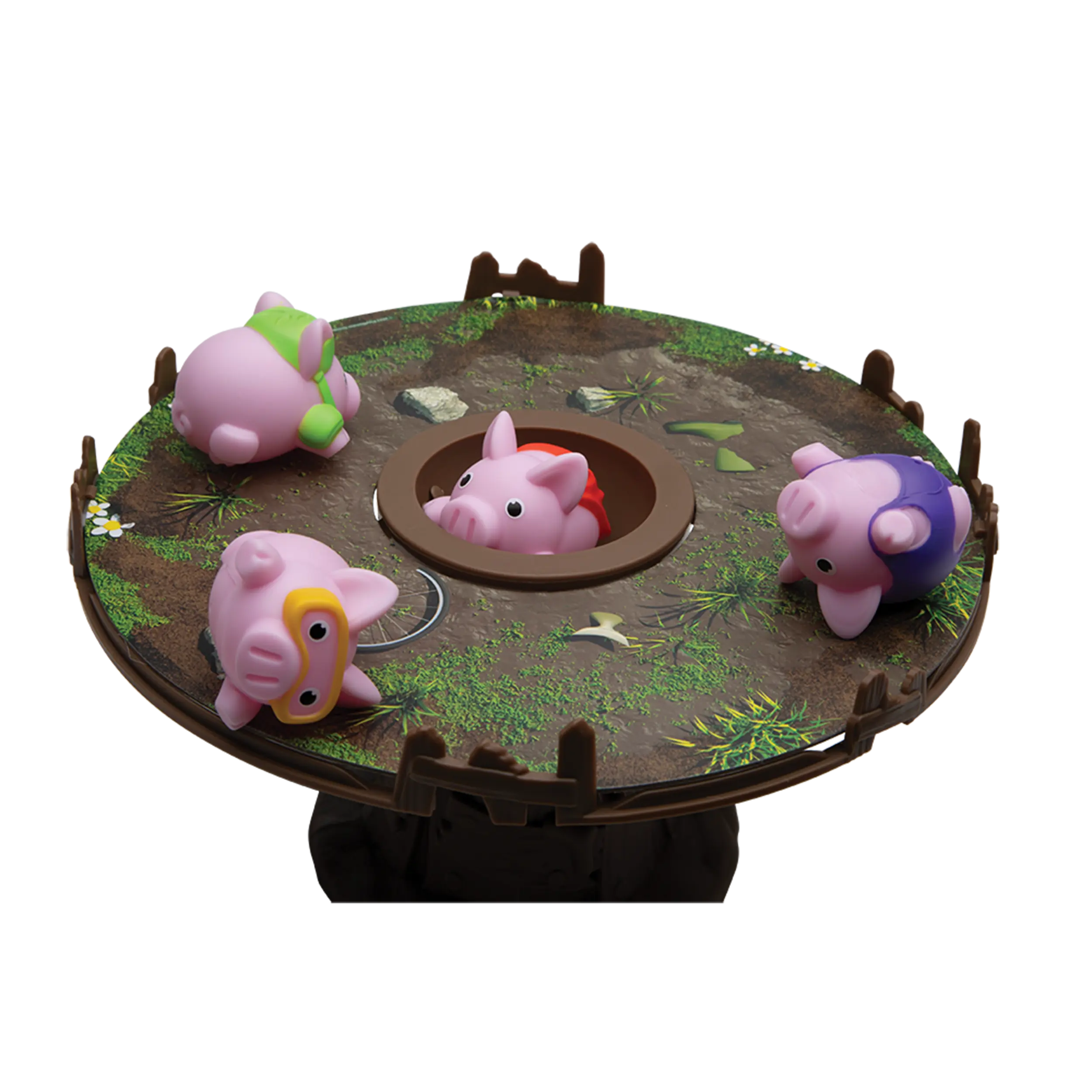 Ve hře Létající prasátka je vaším úkolem rozpohybovat trampolíny a vyslat gumová prasátka do vzduchu tak, aby přistála přímo v blátivé louži uprostřed prasečího chlívku. Každé úspěšné přistání znamená získání cákance bláta, který představuje vítězné body. Hra probíhá svižně a bez čekání – všichni hráči skáčou současně, takže o napětí i smích není nouze.