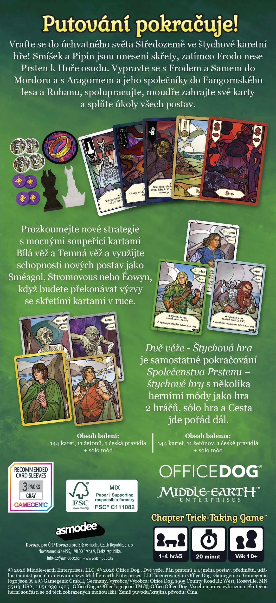 Kooperativní hra Pán prstenů: Dvě věže – Štychová karetní hra je určena hráčům, kteří mají rádi společné plánování, chytré kombinační přemýšlení a atmosféru Tolkienova světa. Zahrajete si ji ve 1–4 hráčích, takže je vhodná jak pro rodiny, tak malé herní skupiny. Doporučený věk je od 10 let, což odpovídá náročnosti štychových mechanismů i proměnlivých úkolů jednotlivých postav. Na jednu partii byste si měli vyhradit zhruba 20 minut, takže se hodí i jako pohodové večerní hraní. Díky kooperativnímu pojetí se každý zapojuje do společné strategie a napínavých rozhodnutí. Dvě věže stojí na dramatickém příběhu druhé části trilogie, ale zvládnou je i hráči bez znalosti předchozí hry. Pokud však máte doma Společenstvo prstenu – Štychovou karetní hru, zde navážete přesně tam, kde příběh předtím skončil.