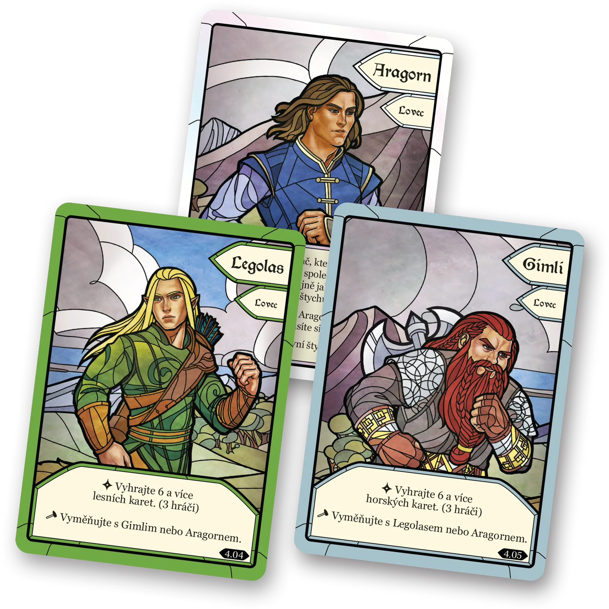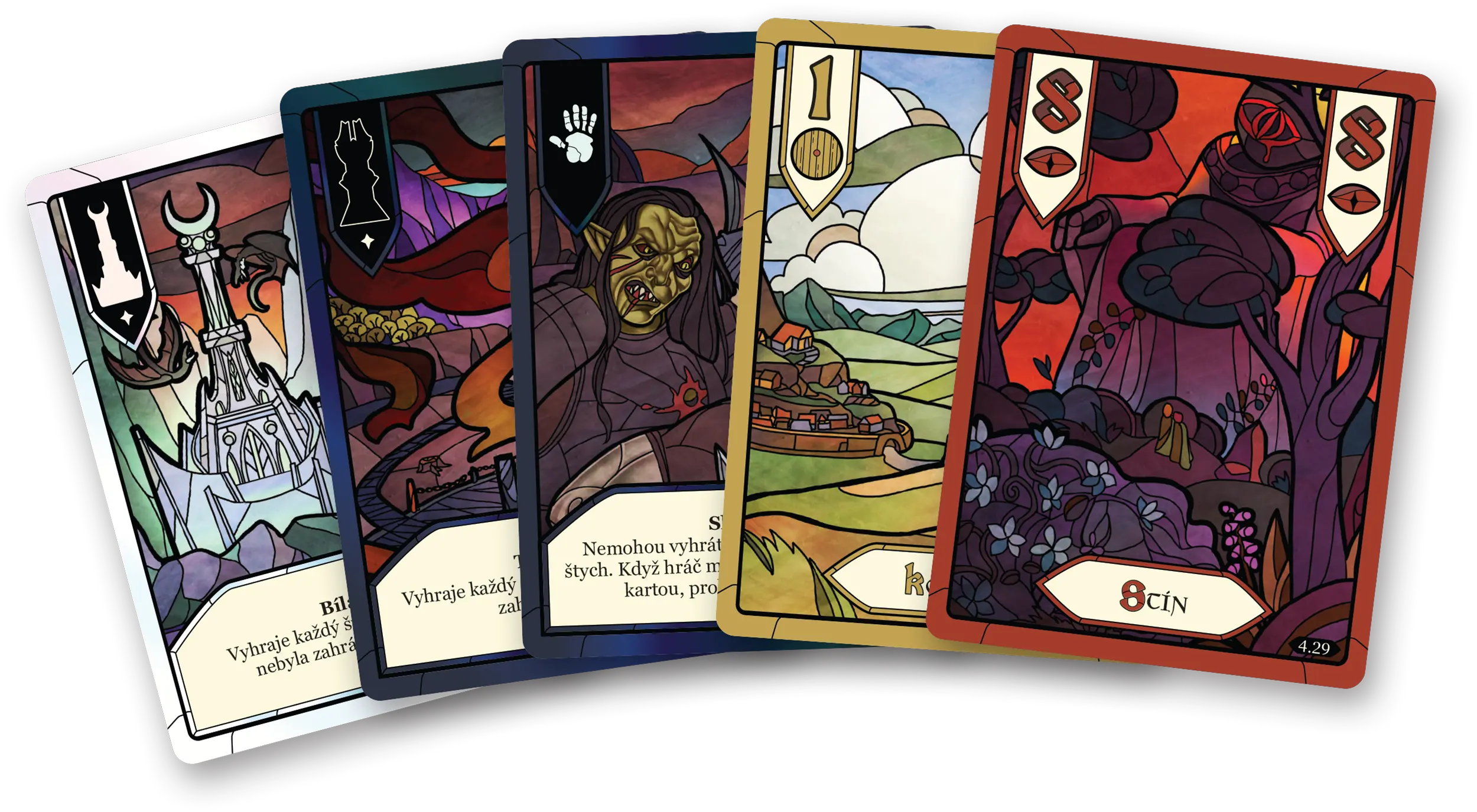 Štychová mechanika vychází z klasických her jako mariáš nebo bridž, ale kombinuje je s jedinečnými prvky Středozemě. Ve hře najdete čtyři klasické barvy (kopce, hory, lesy a stíny), ale také speciální karty – Temnou věž, Bílou věž a skřety, které mění rytmus hry a staví hráče před napjaté situace. Každá kapitola patří k určitému momentu příběhu a přidává speciální pravidla, události či nové postavy. Díky tomu je každé kolo jiné a každá partie přináší jiný průběh.