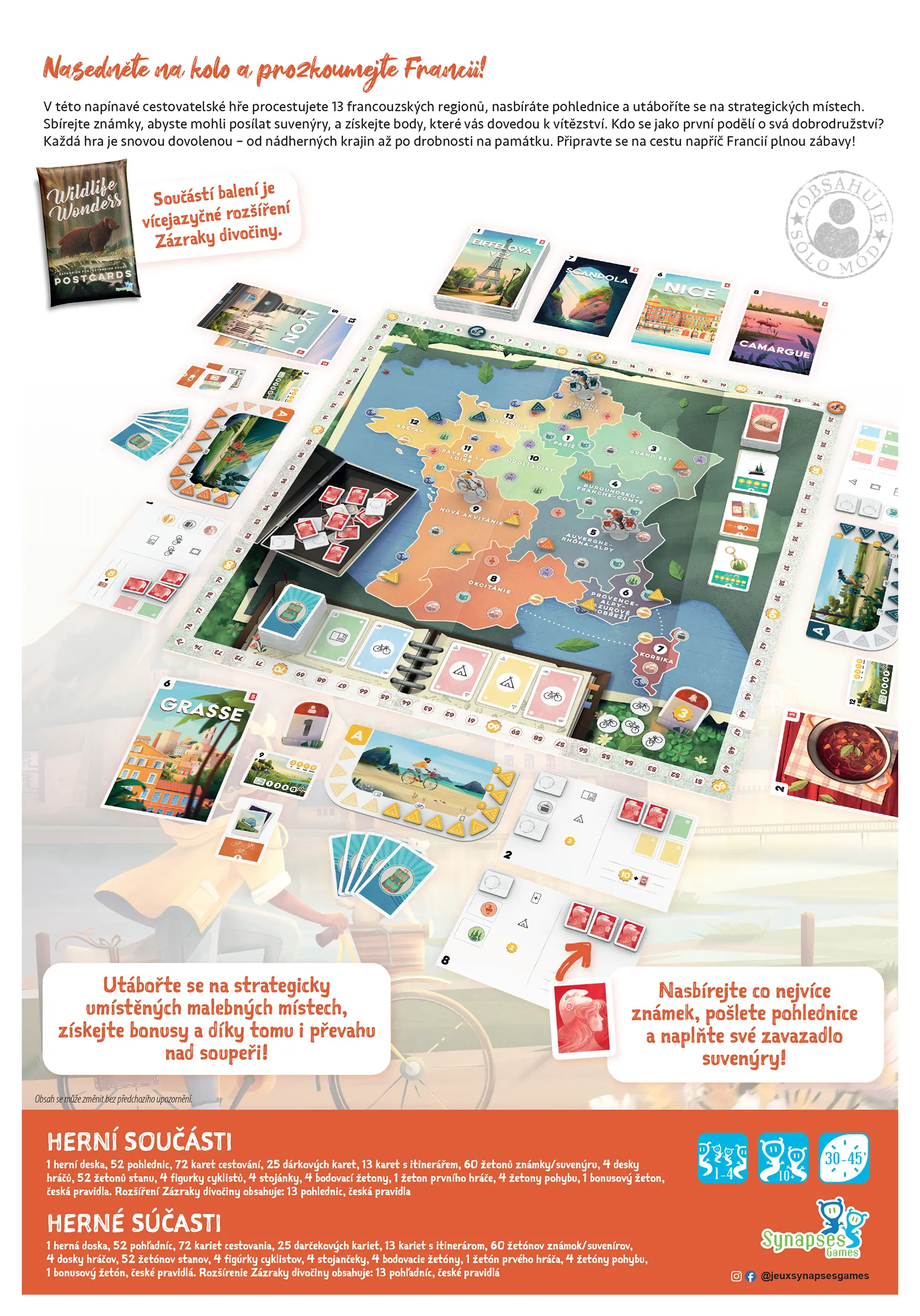 Vydejte se na cyklistickou cestu Francií, sbírejte známky, posílejte pohlednice a stavte tábořiště. Pohlednice přinášejí příjemnou strategii, krásné ilustrace a rozšíření už v krabici.