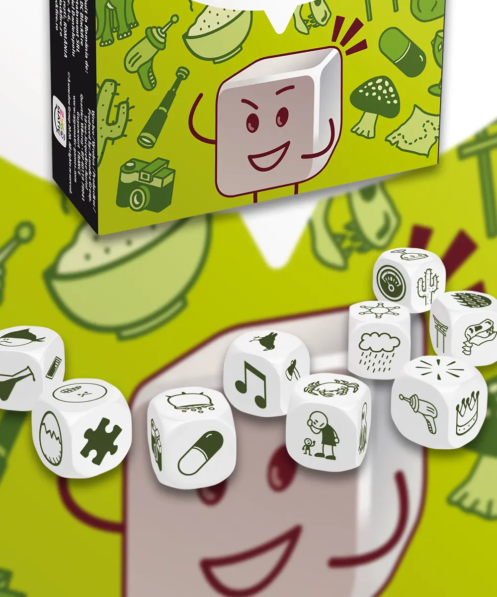 V Příbězích z kostek: Výpravy se stanete vypravěči cestovatelských dobrodružství. Vaším úkolem je hodit devíti kostkami, na kterých jsou místo čísel různé výpravní symboly, a z těchto obrázků vytvořit příběh plný objevů a nečekaných setkání. Začnete třeba slovy „Za devatero horami a devatero řekami..." a pak už jen necháte svou představivost pracovat. Propojte padlé symboly do poutavého vyprávění a ohromte ostatní hráče svými cestovatelskými zážitky. Pamatujte, že v této hře neexistují špatné odpovědi – každý příběh je jedinečnou výpravou hodnou zaznamenání.
