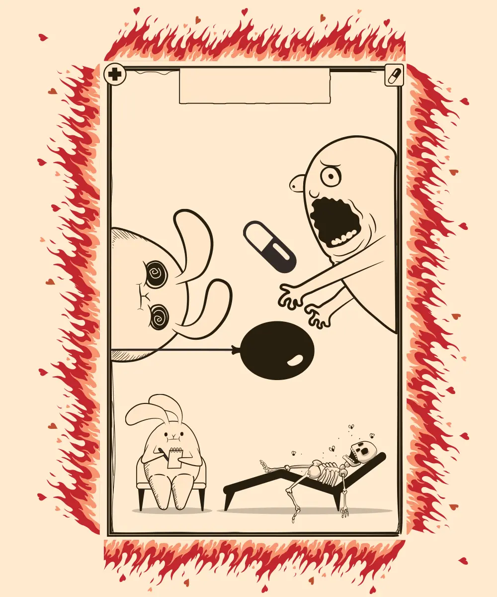 V téhle potrhané karetní hře se z vás stanou terapeuti s diplomem z popelnice za rohem. Vaším úkolem je skládat ty nejšílenější a nejvtipnější komiksy ze tří karet – otázky, odpovědi a terapie. Jako terapeut vybíráte kartu otázky a odpovědi, zatímco ostatní se snaží přihodit tu nejúchylnější „terapii".
