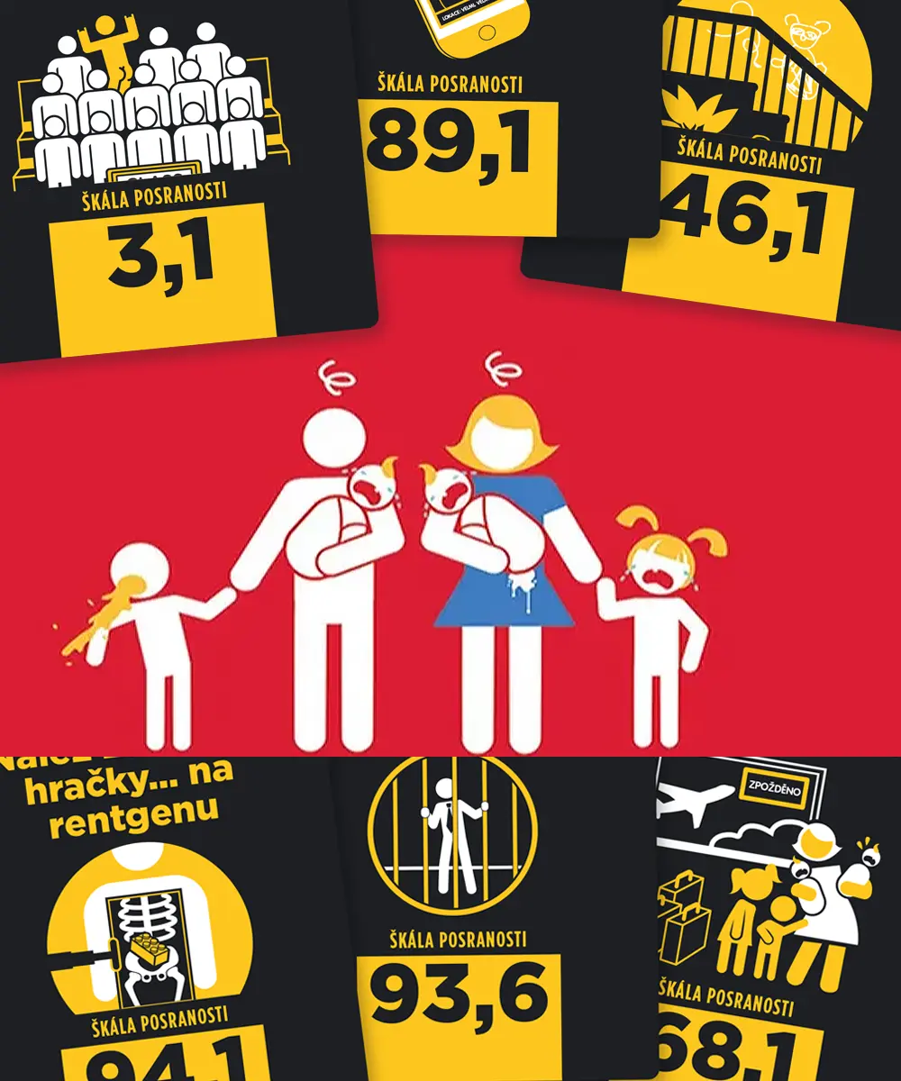 Každá karta obsahuje nějaký děsivý rodičovský moment – od výbuchu plenky ve veřejné dopravě přes dětské výtvarné umění na stěně fixou, co nejde smýt až po okamžik, kdy vaše dítě veřejně zopakuje větu, kterou rozhodně nemělo slyšet.