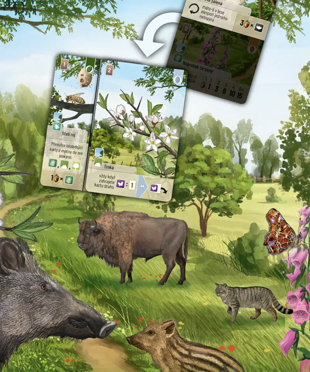 - Objevte unikátní lesní tvory, kteří vás odmění za dobře zvolené sousedství a propojení s ostatními kartami.