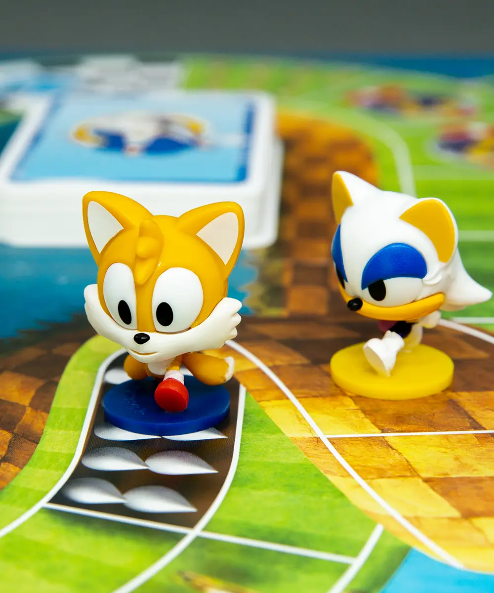 Závodní akce ve hře Sonic a parťáci! Proleťte tratí, překonejte překážky a doveďte svůj tým k vítězství v této rychlé rodinné deskovce.