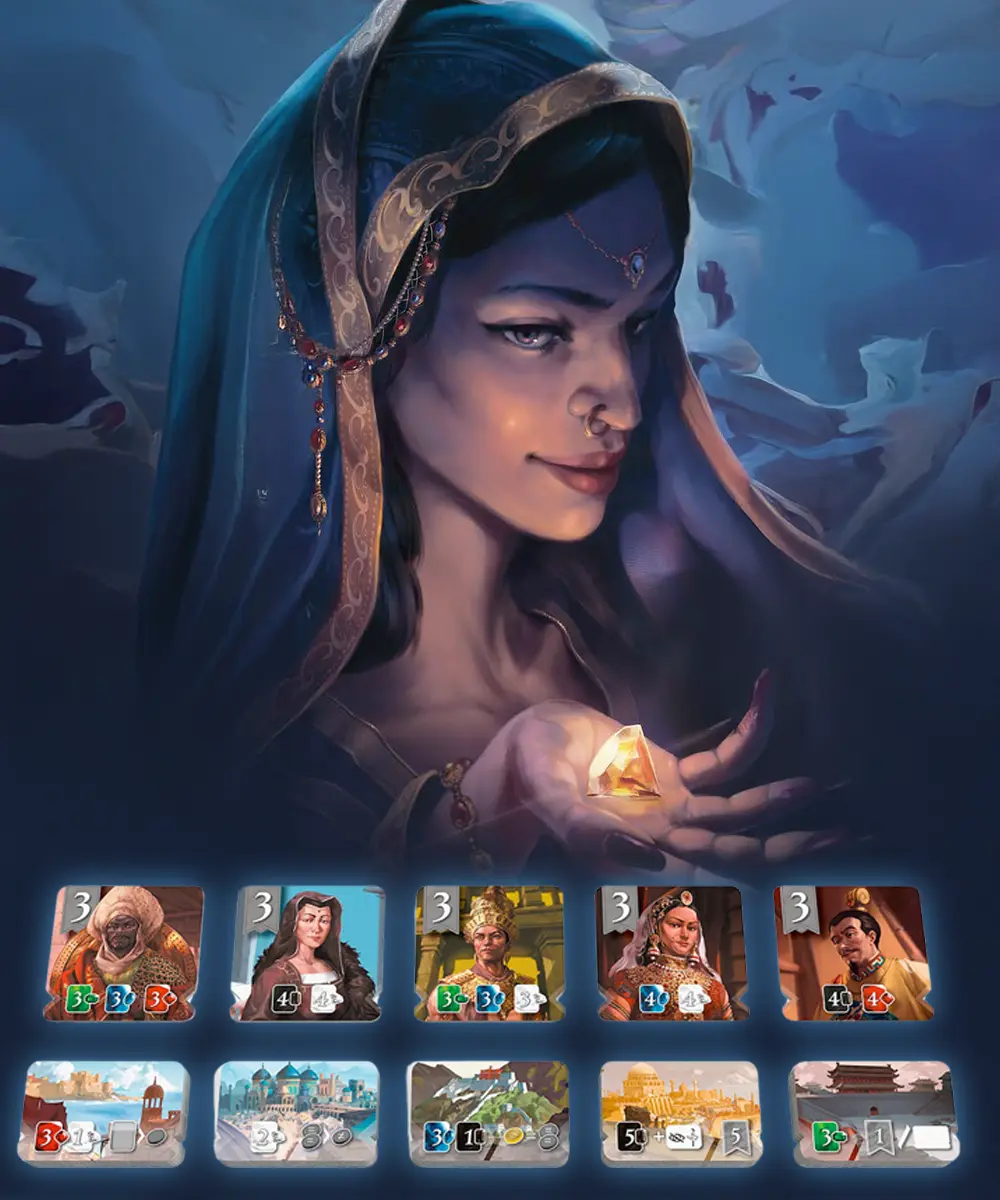 Vydejte se do sedmi slavných měst na Hedvábné stezce – od evropského Amboise, přes exotický Samarkand až po vzdálený Soul – a splňte náročné požadavky místních mecenášů, kteří touží po unikátních špercích. V modulu Města nahraďte šlechtice ze základní hry a vyhrajte splněním konkrétních kombinací bodů prestiže a karet určité barvy.
