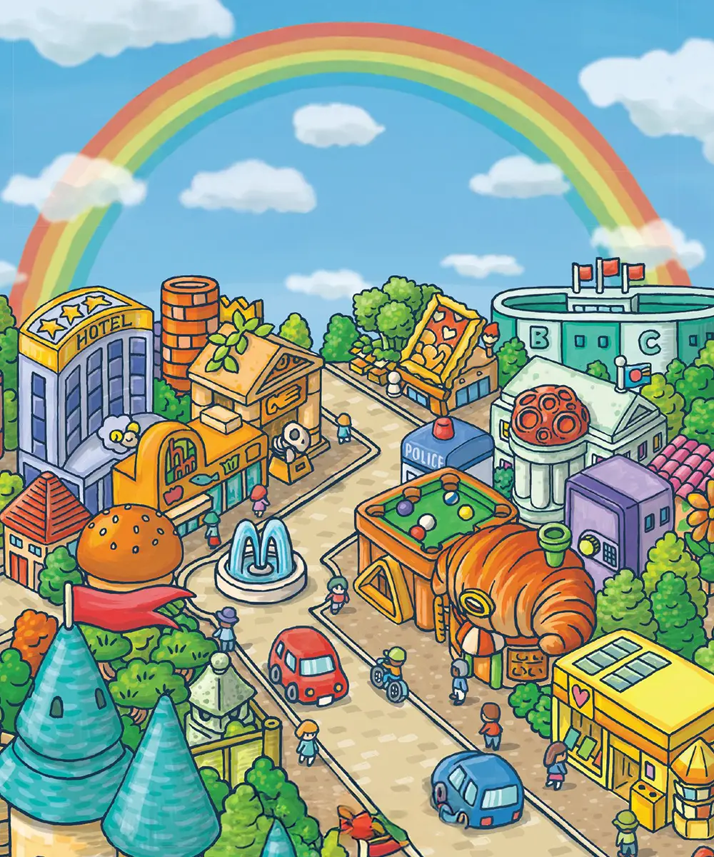 - Krásné, barevné ilustrace budov a obyvatel vás vtáhnou do atmosféry budování vlastního městečka.