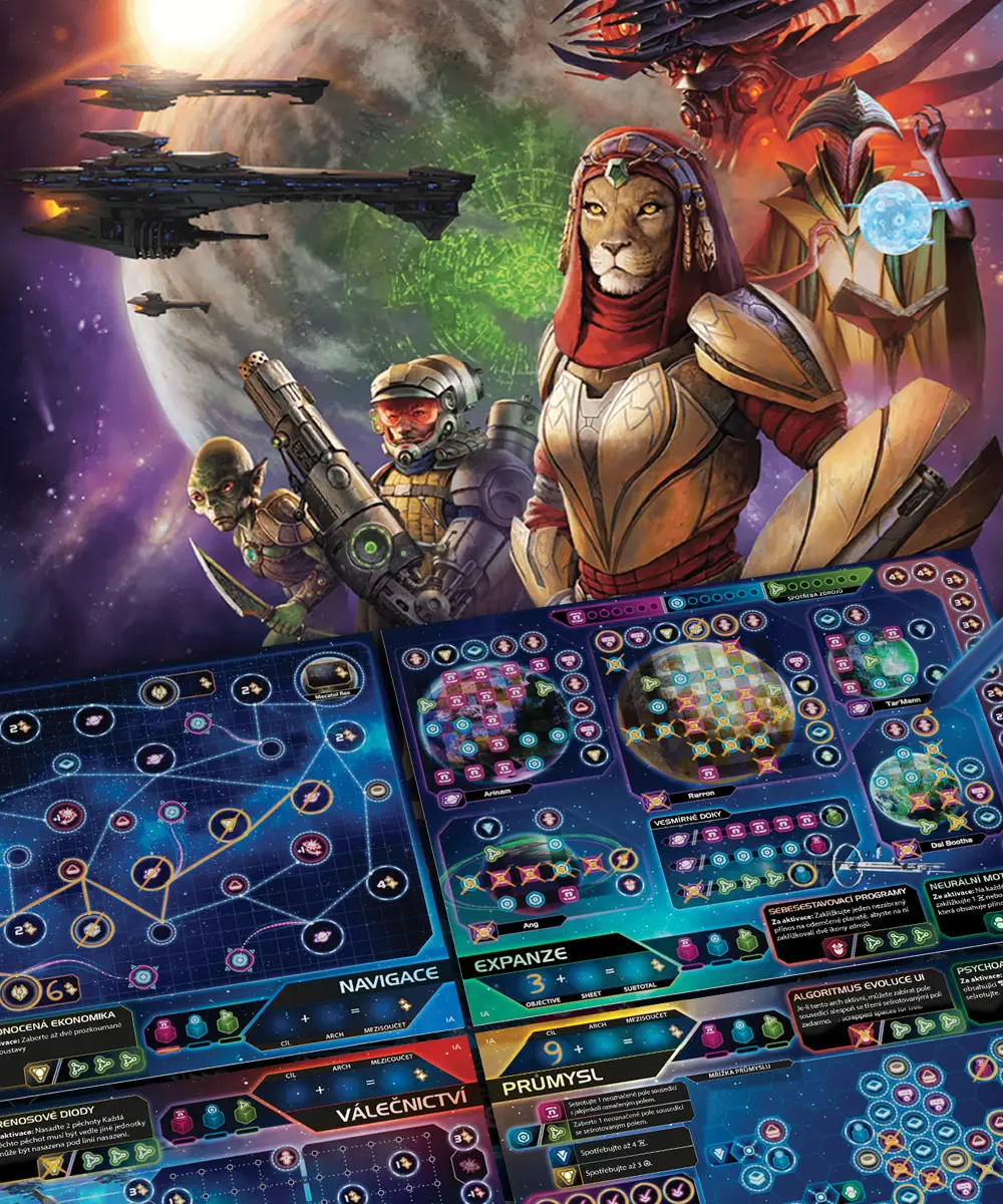 Epické vesmírné dobývání ve hře Twilight Inscription! Budujte civilizaci, expandujte a ovládněte galaxii v této strategické roll & write hře.